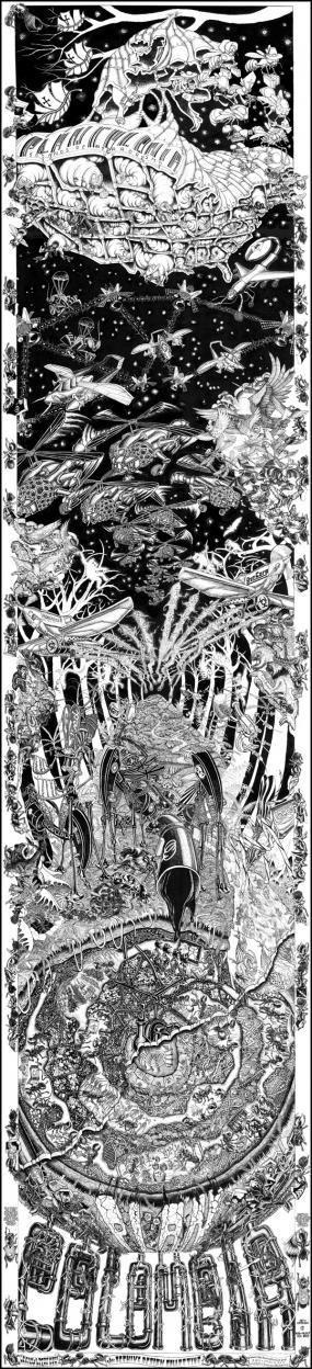 Covering a canvas of 3 meters by 1 meter, this fresco is a product of a process of exchange between artists of the Beehive Collective, based in the United States, and Colombian social movements. This work can be read and interpreted in all languages and by all ages. The work attempts to expose the lies of the war on drugs as a diversion for multinational interests to extract the wealth of biodiversity and natural resources Amazon and its peoples.