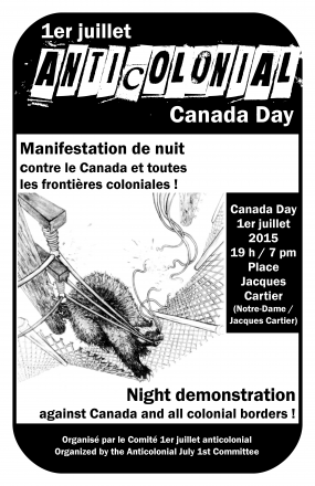 Pour le 1er juillet, une journée qui célèbre cette continuelle histoire de violence, de mort et de traumatismes avec un sentiment de fièrté et de légitimité, nous réitérons notre engagement à lutter CONTRE LE CANADA ET TOUTES LES FRONTIÈRES COLONIALES "Ni Patrie, ni État, ni Québec, ni Canada !"