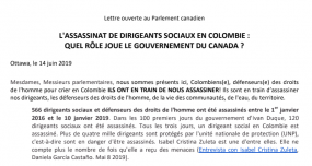Nous demandons au Parlement et au gouvernement canadien d’agir avec toute l'efficacité possible pour assurer la protection de la vie et des droits humains des leaders sociaux en Colombie exposés à la violence inhérente aux projets miniers en Colombie et à tout processus commercial bilatéral qui se développe entre nos pays.