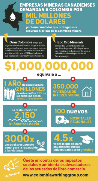 Dos compañías mineras canadienses reclaman 1000 millones de dólares US al gobierno colombiano, en virtud del Tratado de Libre Comercio Colombia-Canadá de 2008, por el delito de proteger una reserva hidráulica y de no haber reprimido las manifestaciones de manera eficaz.