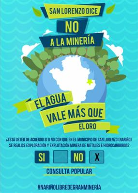 Tras un prologando y participativo proceso comunitario, el próximo 25 de noviembre quienes habitan el municipio de San Lorenzo en el departamento de Nariño se pronunciarían, Sí o No, sobre la explotación minera en su territorio. La consulta va pese a lo decidido en días anteriores por la Corte Constitucional sobre este tipo de consultas, y al bloqueo que desde el ministerio de Hacienda y el organo electoral le han interpuesto a esta iniciativa colectiva, expresión del constituyente primario.
