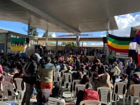 À Bosa, territoire ancestral du peuple Muisca, dans un exercice autonome et auto-organisé, a eu lieu l’Assemblée Nationale Populaire avec la participation de plus de 2000 délégué.e.s. L’assemblée s’est déroulée en présentiel et en virtuel, lors de laquelle se sont réunis des groupes venus de différentes régions du pays, soit des représentants de communautés paysannes et noires ; de peuples autochtones; de processus et mouvement des femmes; d’assemblées et conseils populaires; d’organisations populaires urbaines; d’organisations de travailleurs.euse.s de la production, de l'enseignement, de la santé et des transports; de mouvements sociaux et politiques; de mouvements environnementaux; de mouvements des droits humains ; de Colombiens et Colombiennes à l'étranger ; de processus culturels, artistiques, sportifs et communicationnels ; d’organisations de jeunesse et d'étudiants ; de gardes ethniques, paysannes et populaires ; des premières lignes ; de victimes ; de diversités et dissidences sexuelles ; de mouvements de personnes handicapées et de mouvements communaux.