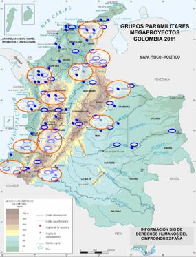 Sur les cartes ci-dessous, on peut voir que la localisation des grands projets des multinationales correspond avec l'implantation des groupes paramilitaires et les zones de déplacement des populations.