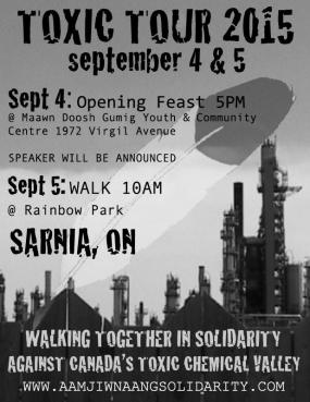 Chaque année, l’organisation de base et sans but lucratif Aamjiwnaang and Sarnia Against Pipelines organise un Toxic Tour afin de sensibiliser les gens à propos des impacts des extractions des ressources dans ce qu’on appelle Chemical Valley et qui ont des impacts néfastes direct sur le territoire de la communauté d’Aamjiwnaang. Aamjiwnaang est entourée par 40% de l’industrie pétrochimique canadienne, avec des industries comme Suncor, Shell, DOW Chemicals, et Lanxess en tant que voisins de la communauté (en plus de plusieurs autres compagnies).