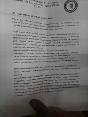 A esto se agrega el panfleto emitido por el grupo post desmovilización de las AUC “Los Rastrojos”, en que declaran “objetivo militar” a “Luis Fernando Arias y demás directivos de ONIC (…) Autoridades Indígenas del CRIC y sus agitadores Ayda [Quilcue], Feliciano Valencia, Consejeros Mayores, asesores Gilberto Yajue, Luis Acosta, Enry Caballero, Jorge Vicente Otero (…) ACIN, Medios de Comunicación del Suroccidente e indígenas populares”. Haciendo un “llamado para que en menos de 24 horas, a partir de la fecha, regresen a sus sitios de origen” SIC.