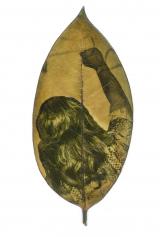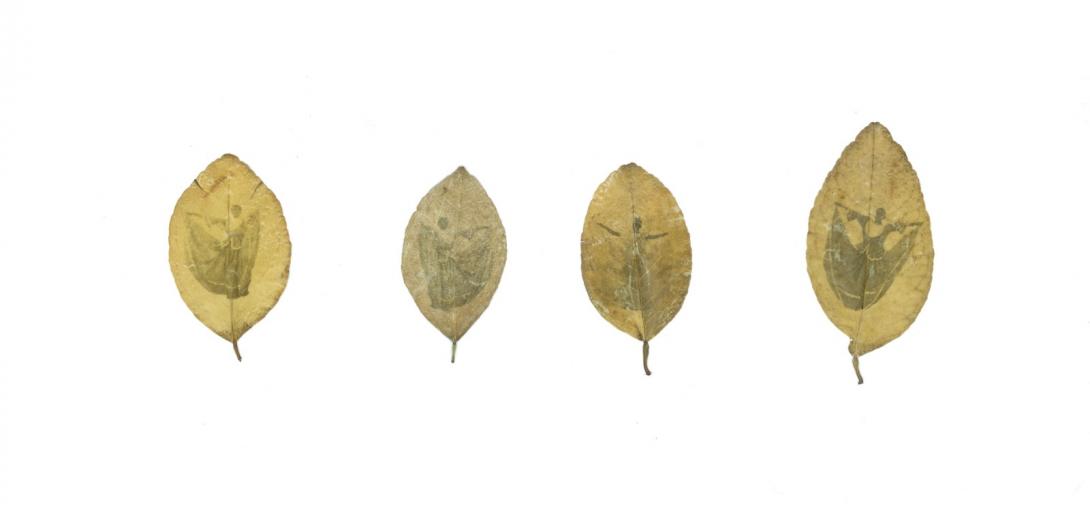 Arriba, clorotipos sobre hoja de tilo, representando jóvenes bailarines durante la visita de la Caravana Humanitaria por la Paz, la Vida y la Permanencia Territorial 2024 en Micoahumado. Los resultados de las impresiones se compartieron con los jóvenes bailarines durante el taller.