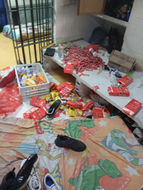 Troisièmement : C’est par nos propres moyens que nous avions jusqu’alors pu répondre aux besoins de base, auxquels n’avaient pu répondre ni l’établissement carcéral, ni l’Unité des Services Pénitentiaires (USPEC), ni l’entreprise sous-traitante chargée de l’administration du magasin officiel et des services de santé. Voilà pourquoi nous sommes surpris par les actions illégales du capitaine Devia Molano Diego. Ignorant la grave crise humanitaire qui sévit dans les prisons du pays et s’éloignant de la Politique d’humanisation carcérale prônée par la Direction générale de l’INPEC (Instituto Nacional Penitenciario y Carcelario), le capitaine a pris la décision arbitraire de voler certains produits alimentaires (thon, saucisses, haricots, riz, sardines, lait en poudre, cigarettes, soupes instantanées, jus frutiño, huile, sucre, avoine) ainsi que d’autres éléments personnels des PPL (parfums, vêtements, bijoux en or, médicaments pour la grippe et maladies communes), tout cela confisqué de façon irrégulière sans que ne soit rempli de rapport de saisie, ouvrant ainsi la porte à la corruption qui sévit au sein de l’INPEC.