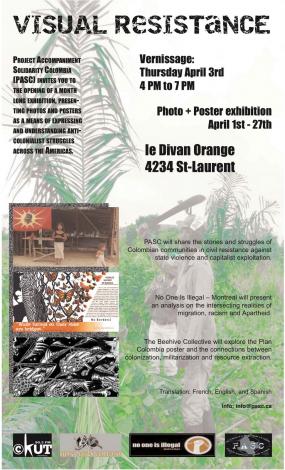 Exposition photo + affiches Du 1er au 27 avril Vernissage : Jeudi 3 avril 16h à 19h le Divan Orange 4234 St-Laurent Le Projet accompagnement solidarité Colombie (PASC) vous invite au vernissage et à l'exposition tout au long d'avril, présentant des photos et affiches comme moyen d'expression et de compréhension des luttes anti-colonialistes à travers les Amériques. Présentations: - Le PASC va partager les histoires et les luttes de communautés paysannes colombiennes en résistance contre la violence étatique au service du développement capitaliste. - Personne n'est illégal – Montréal va présenter une analyse des intersections entre migration, racisme et Apartheid. - Le Collectif de la Ruche vous invite à participer dans une exploration de l'affiche du Plan Colombie et des connections entre le colonialisme, la militarisation et l'exploitation des ressources naturelles. Traduction vers le français, l'anglais et l'espagnol. Une co-présentation de CKUT Contact : 514.966.8421 - info@pasc.ca